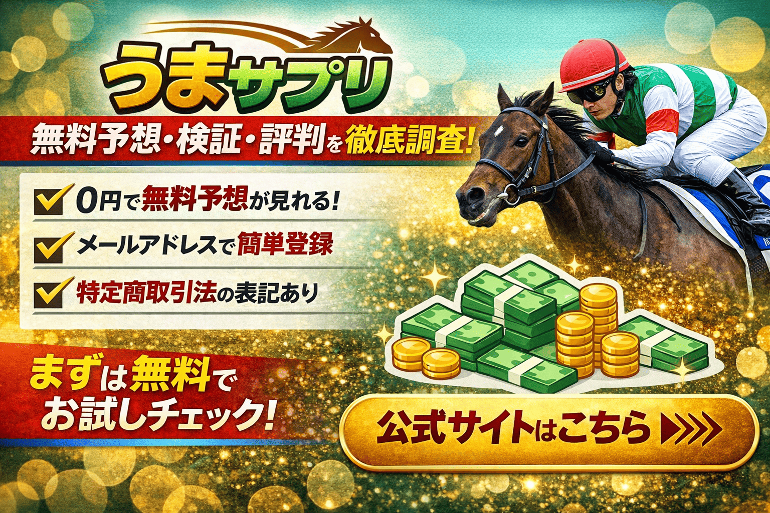 うまサプリ|評価・検証・口コミ 更新日:2026年3月24日 公開日:2018年6月27日 優良競馬情報会社一覧 うまサプリ|評価・検証・口コミ うまサプリは、中央競馬を中心に無料コンテンツと有料情報を提供している競馬情報サイトです。 本記事では、公式サイトで確認できる基本情報・無料予想の特徴・特定商取引法の記載有無を整理しながら、 […] 続きを読む