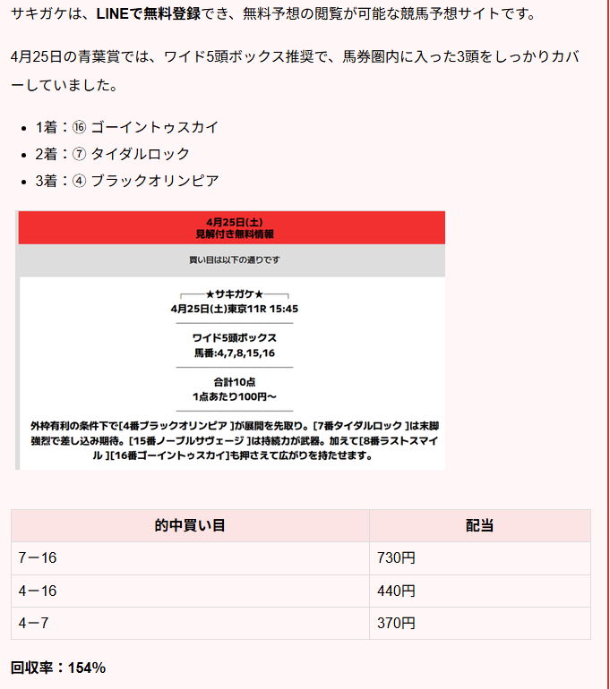 天皇賞春の前週には、重賞レースで無料予想の的中が確認されたサイトもありました。 ここでは、実際に前週重賞で結果を出したサイトをピックアップしておきます。